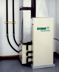 The indoor unit is attached to the outdoor ground loop. Once water, which has circulating through the loop, enters the heat pump the unit removes the heat and transfers it throughout your home in the winter. In the summer this process is reversed, the unit removes the heat from the indoor air and injects it into the ground loop water, leaving behind air conditioning. As you can see heat is transferred to and from the ground, there is no fuel being burned (and therefore no gas bill to pay).
